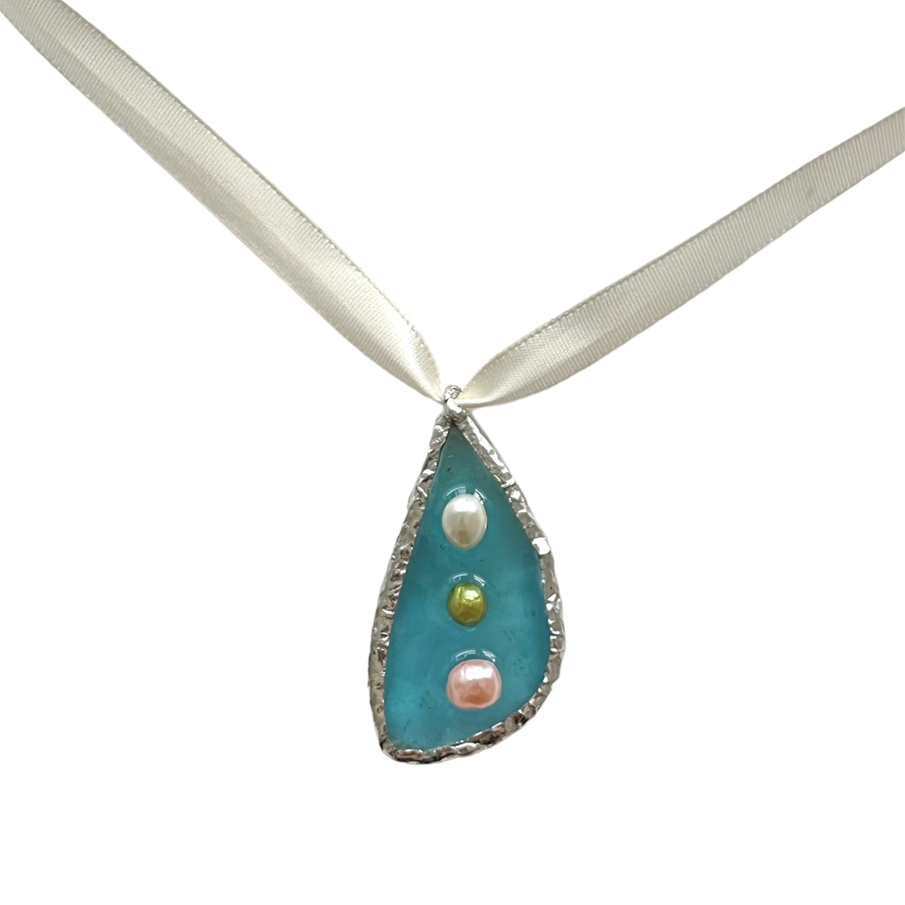 16 in satin ribbon with a closure on the back, freshwater pearl, handmade pendant about 2.5 in