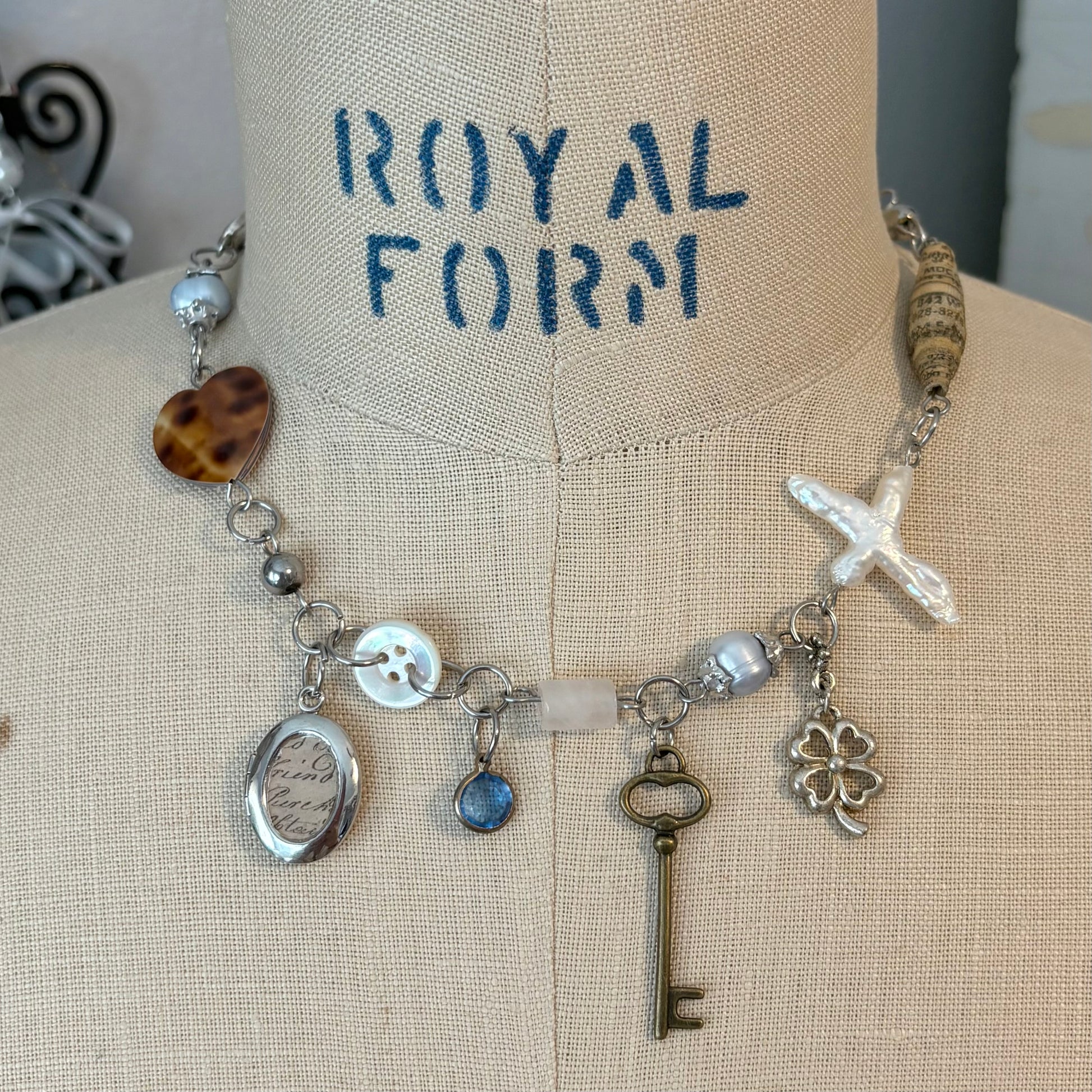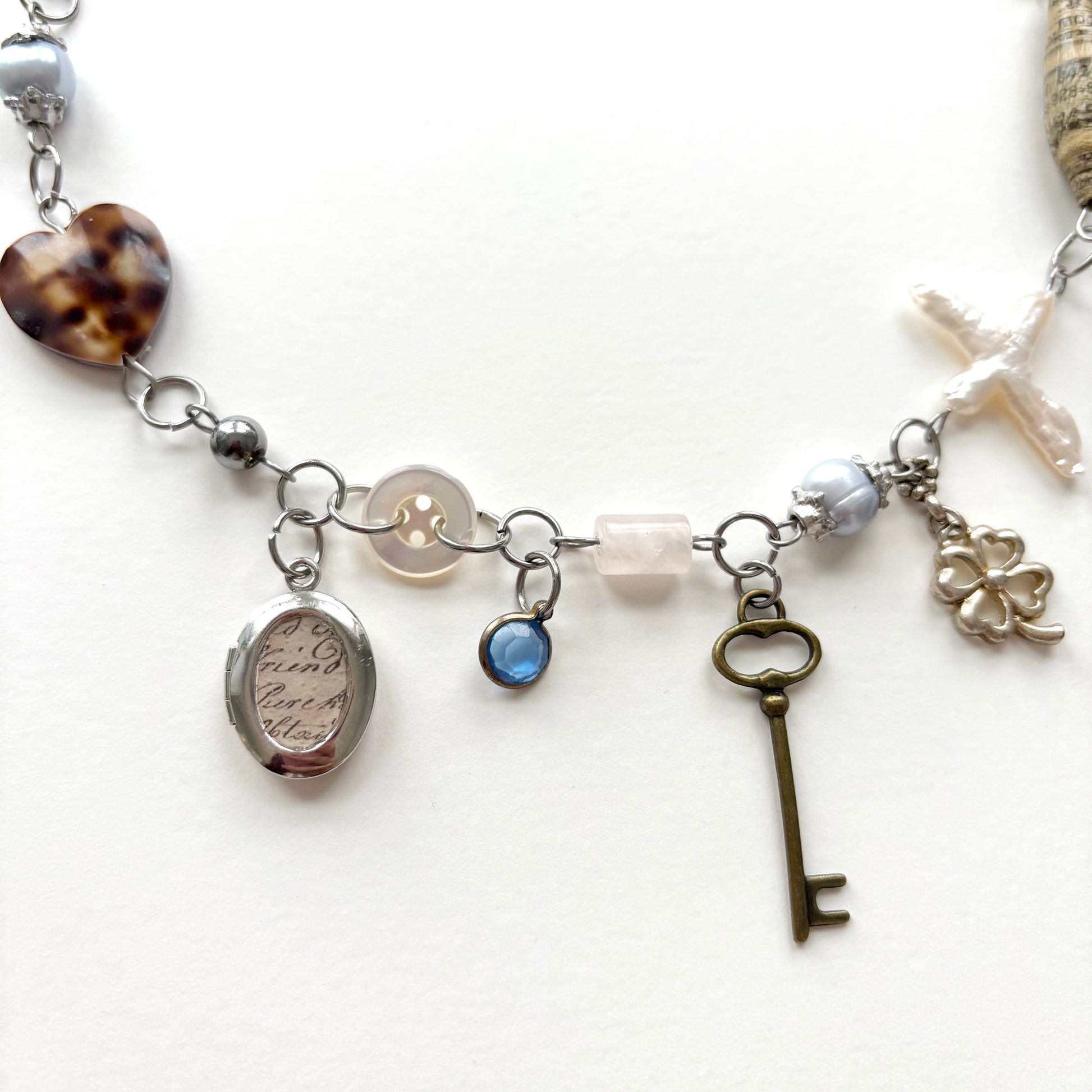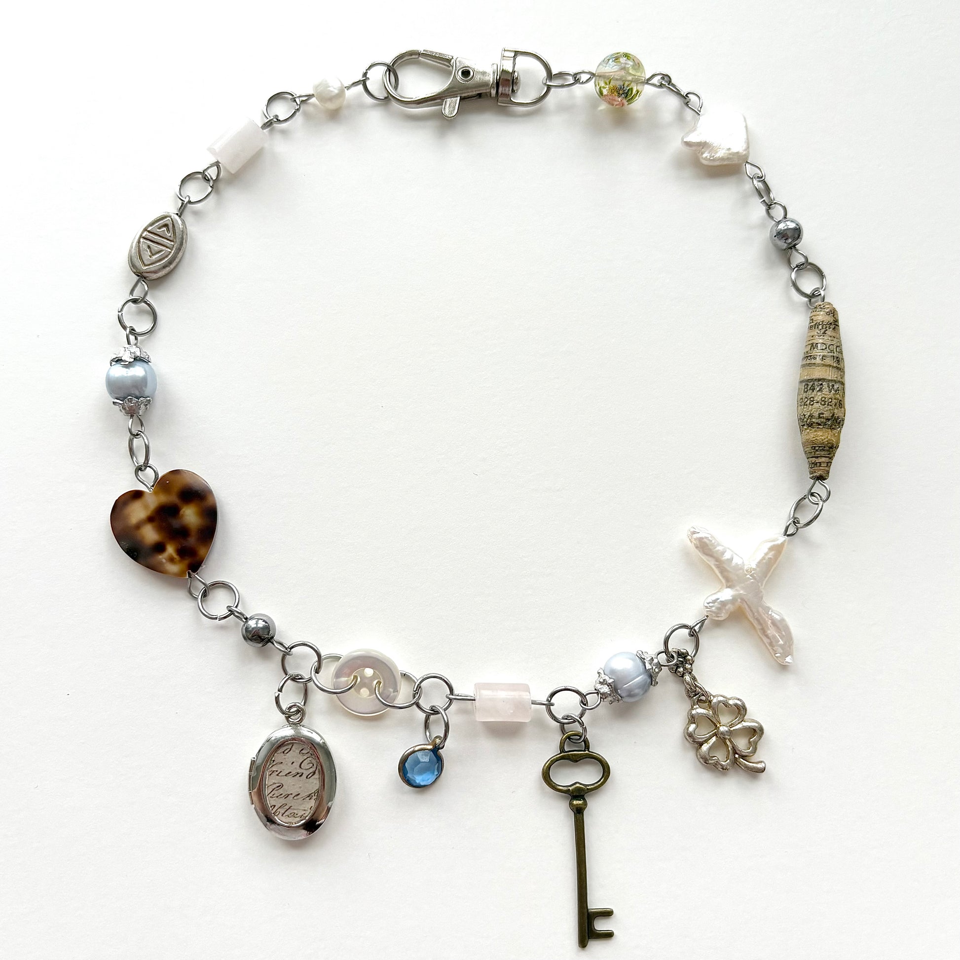 made with lots of glass beads, freshwater pearls, and various charms :3