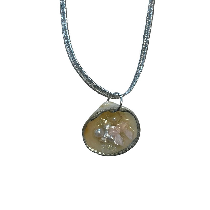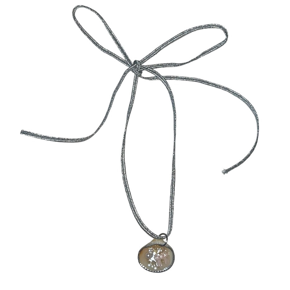 handmade shell pendant on a silver sparkly cord that ties into a bow
