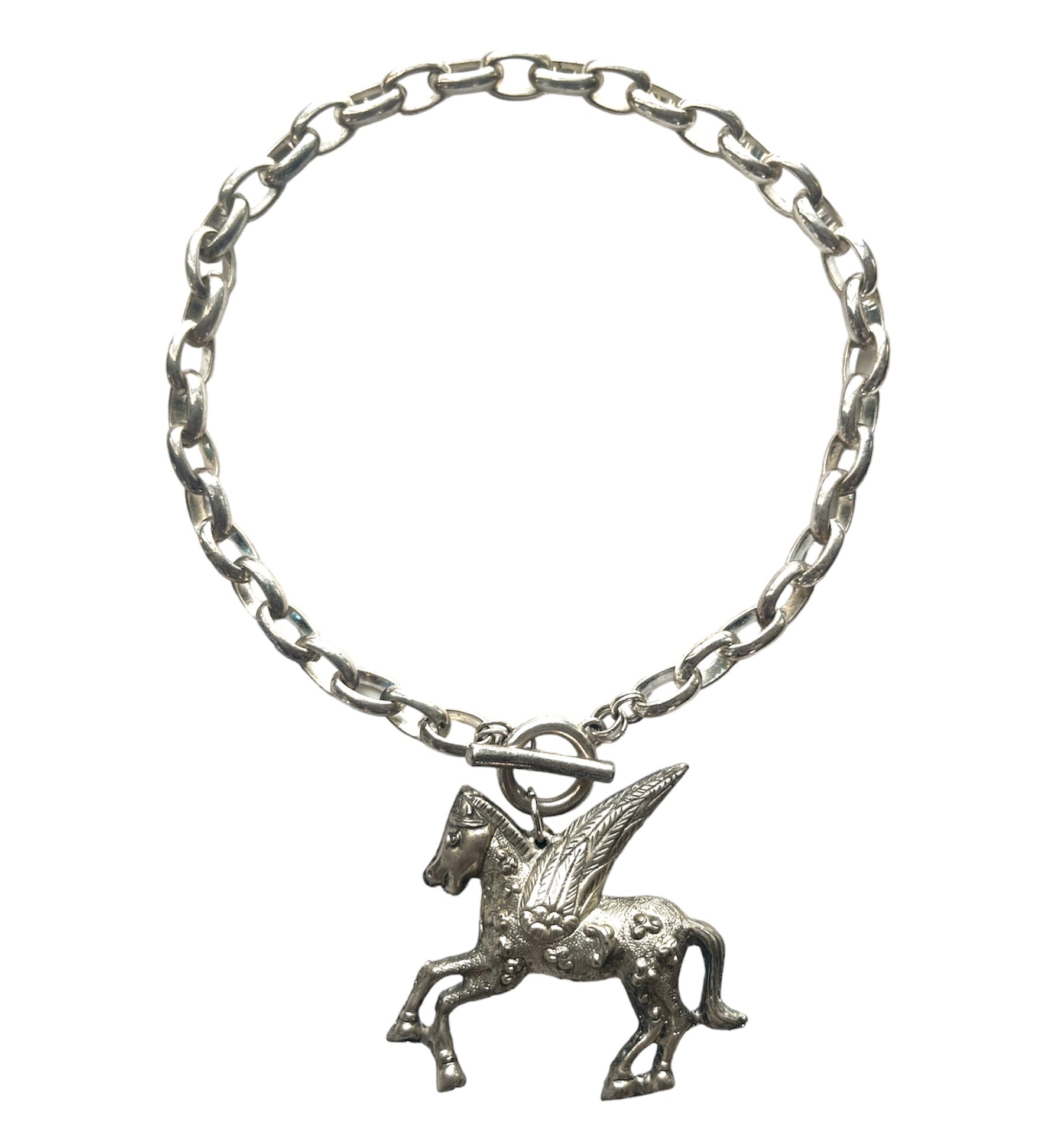 comes on a loose choker style chain that closes and opens in the front + a vintage unicorn pendant